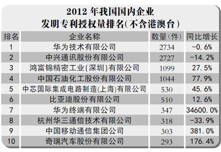 華為終端有限公司(下稱華為終端)2012年的中國發(fā)明專利授權(quán)量達(dá)347件,首次進(jìn)入國內(nèi)企業(yè)發(fā)明專利授權(quán)量排名前十。
